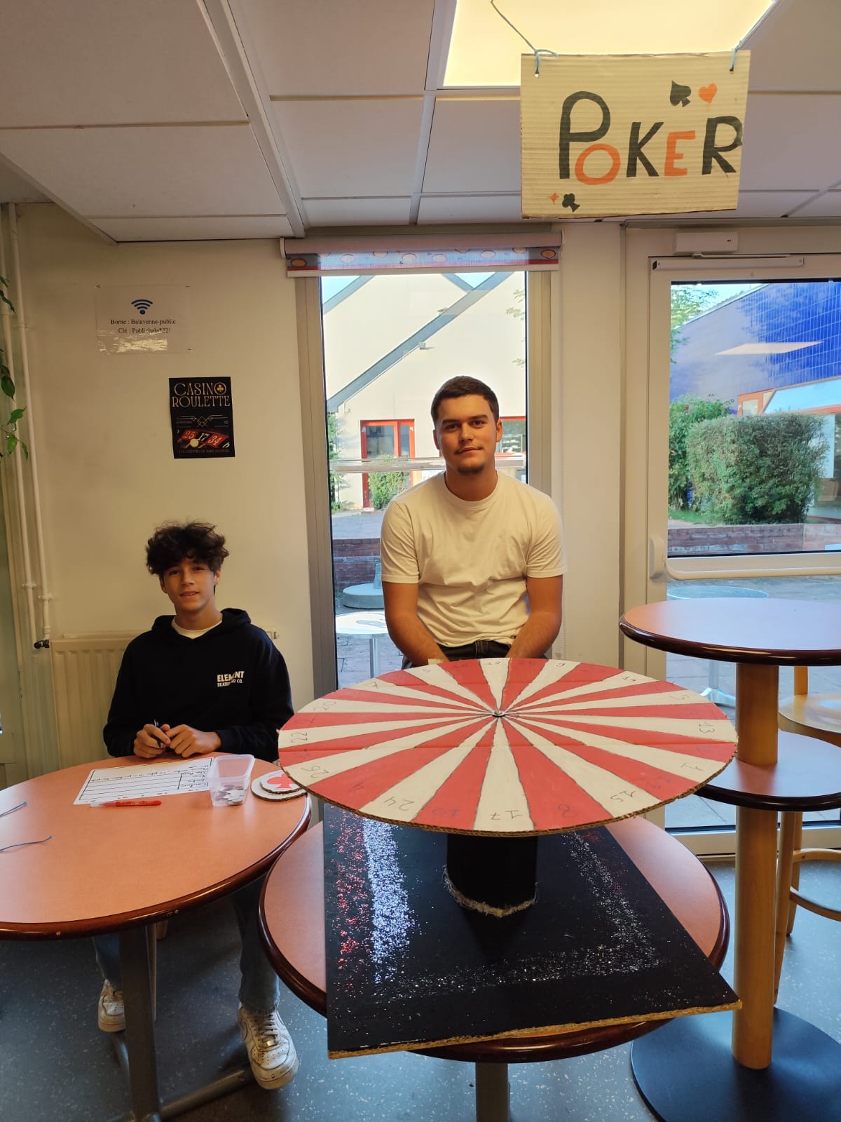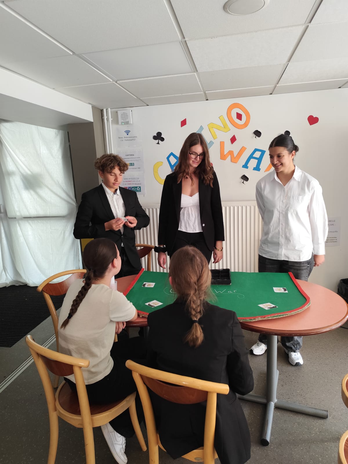 La matinée débute par une immersion dans un casino grandeur nature, organisée par les élèves de Première. Tenue chic et stratégie sont de mise autour des différentes tables de jeux, permettant aux nouveaux élèves de s’intégrer dans une ambiance conviviale.