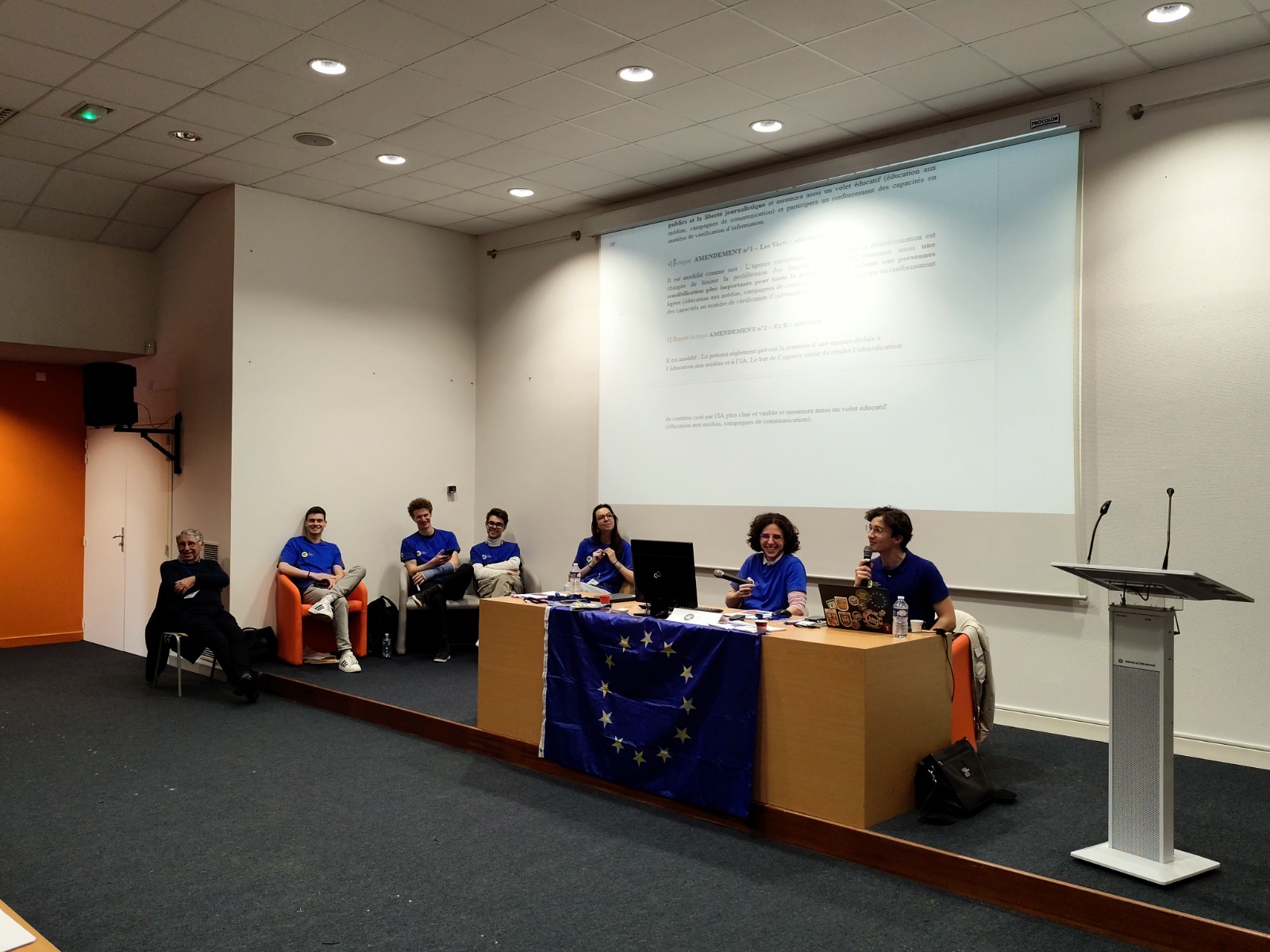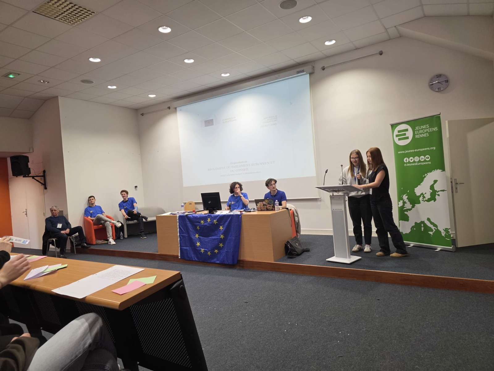 Cette simulation est encadrée par sept bénévoles des Jeunes Européens et du Mouvement Européen de Rennes, qui accompagnent les élèves dans les différentes étapes du processus parlementaire.